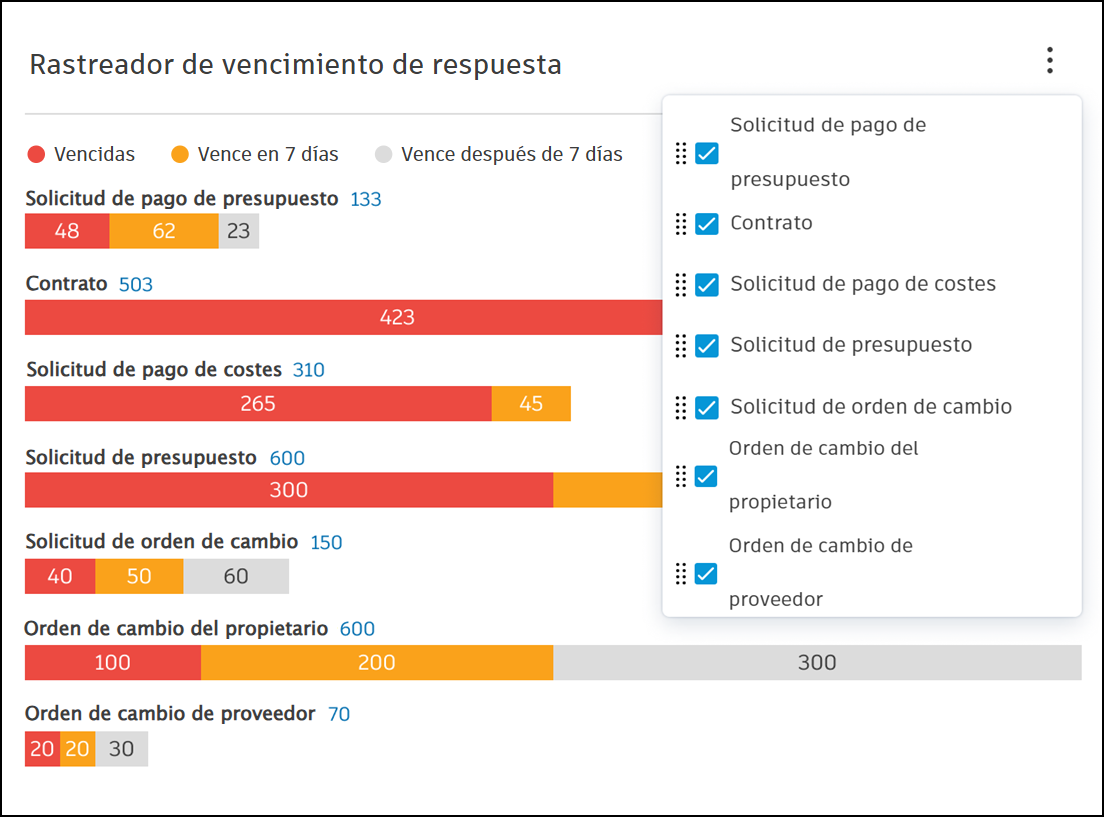 El menú muestra todas las fichas que contienen elementos con un atributo de Vencimiento de respuesta. Los miembros pueden seleccionar o anular la selección de elementos de menú para activar o desactivar la visualización de sus correspondientes gráficos de barras.