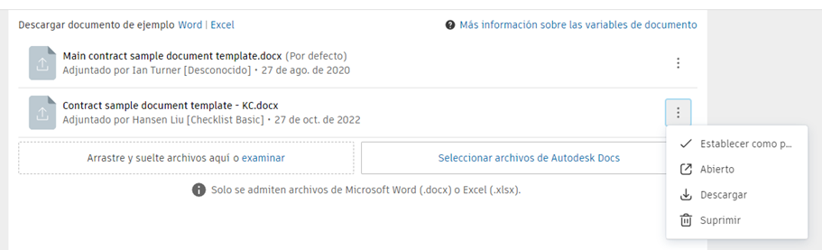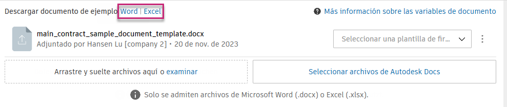 Seleccione Descargar documento de ejemplo para descargar una plantilla de Word o Excel que se puede personalizar. Trabaje desde un archivo de Microsoft Word o Excel y añada las variables necesarias. Obtenga más información sobre las variables disponibles para documentos.