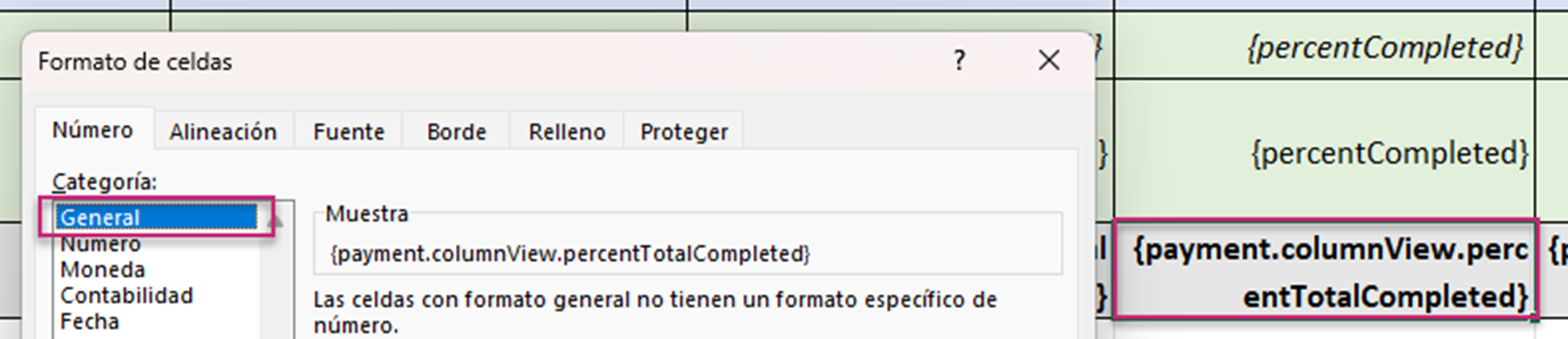 Para introducir un valor de porcentaje en la columna de porcentaje de la plantilla de Excel, aplique el formato General a las celdas. Durante la importación a Cost Management, la plantilla interpretará automáticamente el valor como porcentaje (por ejemplo, utilice 12.39 para 12.39%).