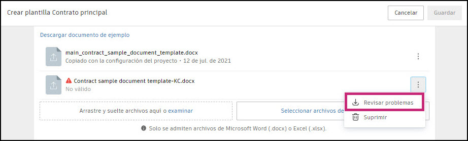 Durante el proceso de creación de plantillas de documento, es posible que desee descargar y editar una plantilla de documento de ejemplo. Para ello, seleccione Word o Excel para descargar un archivo de Word o Excel personalizable.