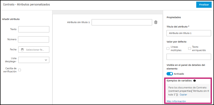 El formato de estos atributos personalizados es {xxx.properties["Título del atributo"]}.