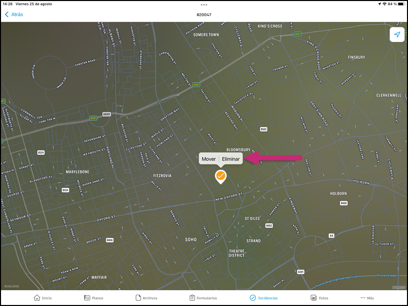 b. Pulse la chincheta de la incidencia y, a continuación, pulse Mover o Suprimir en el menú.