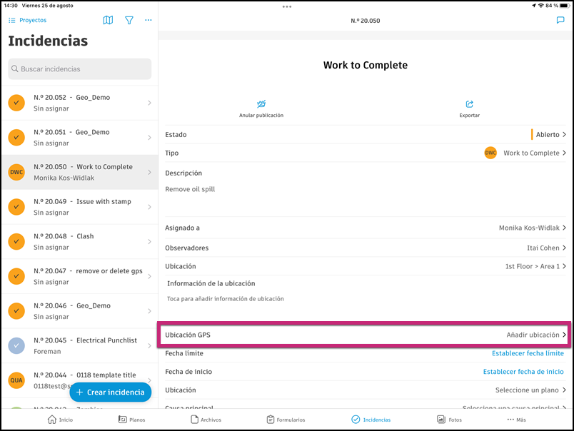 Consulte Incidencias en la aplicación móvil Autodesk Construction Cloud (iOS) para obtener más información sobre cómo trabajar con incidencias con el dispositivo móvil iOS.