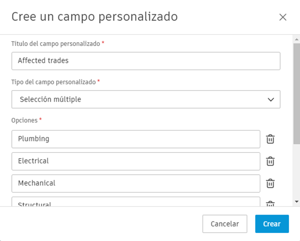 Seleccione un tipo de campo personalizado. Entre los tipos disponibles se encuentran: