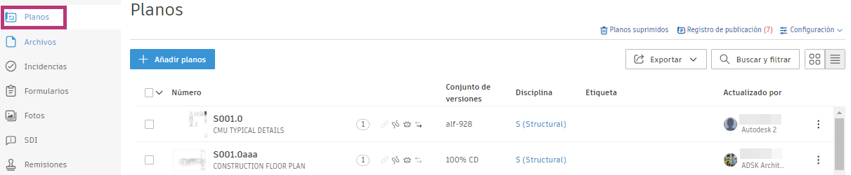 Los solicitantes de documentos pueden utilizar la herramienta Planos para publicar planos para utilizarlos en el campo. Autodesk Build utiliza el reconocimiento óptico de caracteres (OCR) para leer los archivos PDF que se añaden al proceso de publicación de planos. Después de extraer cada archivo en planos independientes, el OCR extrae automáticamente los números de plano y los títulos de plano para su revisión. Puede editar los números y títulos de plano de forma individual o masiva antes de publicarlos en el campo.