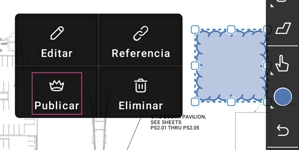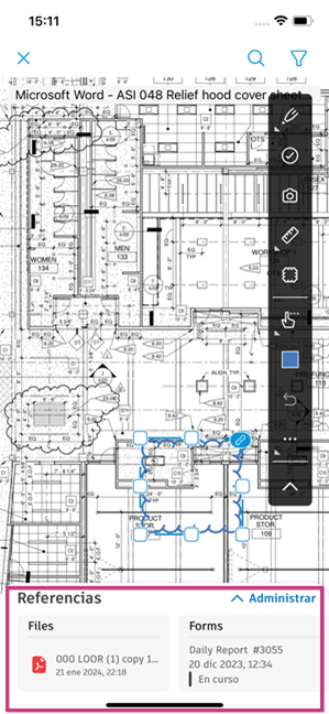 En Autodesk Construction Cloud mobile app, puede añadir referencias a otros planos, archivos, SDI, formularios, presentaciones y activos de una marca de revisión.