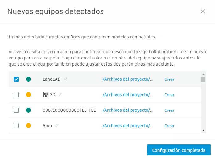 Si tiene modelos guardados en una subcarpeta de Archivos de proyectos en la herramienta Archivos de Docs, Design Collaboration detecta los archivos y solicita la creación de un equipo para esa carpeta. Esto permite ahorrar tiempo a la hora de configurar Design Collaboration para varios equipos o incluso para la colaboración interna. La notificación aparece en la herramienta Inicio y en la herramienta Configuración.