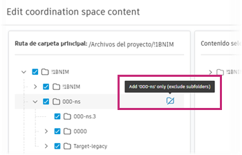 Nota: La estructura de carpetas no se replica en el espacio de coordinación. Todos los modelos de las carpetas seleccionadas se mostrarán en orden alfabético en una única estructura de repositorio plana en la herramienta Modelos.