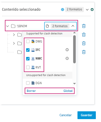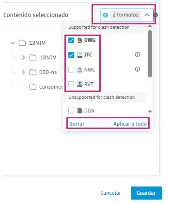 Sugerencia: En los espacios de coordinación con la detección de interferencias desactivada, se aplica inmediatamente la configuración de formato de archivo seleccionada. En los espacios de coordinación con la detección de interferencias activada, la configuración del formato de archivo no se reflejará en la herramienta Modelos hasta que la última comprobación de interferencias haya terminado de procesarse.