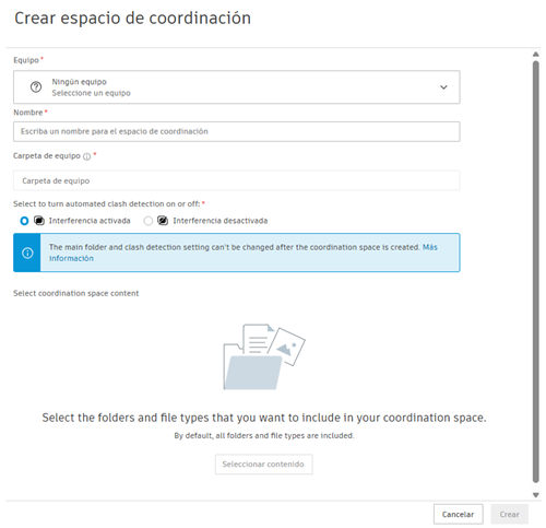 Los espacios de coordinación se pueden crear con la detección de interferencias activada o desactivada. Cuando la detección de interferencias está activada, las interferencias se detectan automáticamente entre los objetos de los modelos. Los espacios de coordinación con la detección de interferencias desactivada permiten que los miembros del proyecto realicen agregaciones de modelos, revisiones de viabilidad de la construcción y creaciones de incidencias, sin generar datos de interferencias. Los espacios de coordinación también se pueden configurar para que solo incluyan formatos de archivo específicos.