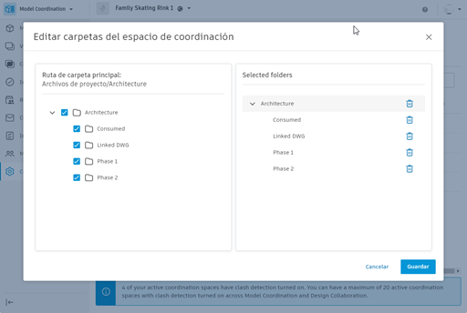 Los espacios de coordinación proporcionan un área para revisar y detectar interferencias entre el conjunto más reciente de modelos de proyectos 3D. En Model Coordination, estos espacios se configuran en carpetas de la herramienta Archivos de Docs. Del mismo modo, en Design Collaboration, los espacios de coordinación se pueden crear en carpetas compartidas o de equipo para mejorar los flujos de trabajo de revisión de diseño. Consulte la ayuda de Model Coordination para obtener más información sobre las funciones de revisión de modelos, interferencias y espacios de coordinación.