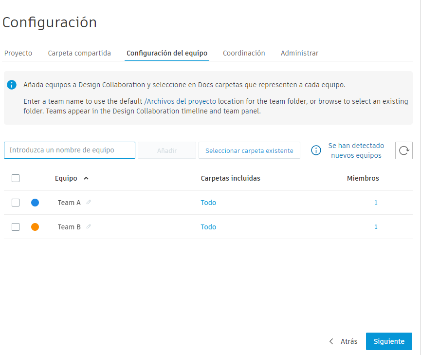 Los dos equipos aparecerán en la secuencia temporal del proyecto en Design Collaboration: