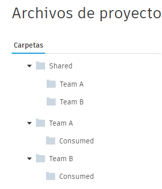 Todas estas carpetas se crean cuando se añaden equipos con la herramienta Configuración de Design Collaboration. La carpeta compartida y las subcarpetas de cada equipo representan el espacio compartido de todos los equipos. La carpeta Consumido y la carpeta de equipo principal representan el espacio de equipo de cada equipo individual.