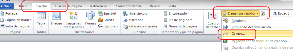 Para insertar un nuevo campo MergeField, utilice la cinta de opciones Insertar, seleccione Elementos rápidos y Campo: