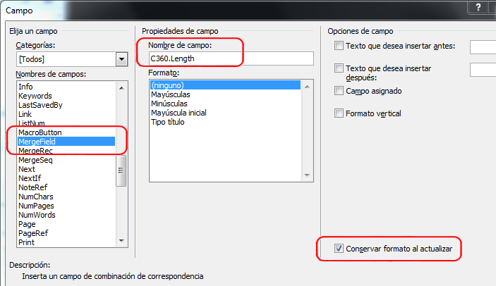 En el cuadro de diálogo, seleccione MergeField, escriba C360.xxx como nombre del campo y deje todas las opciones sin modificar. Es especialmente importante dejar la casilla de verificación Conservar el formato durante las actualizaciones activada.