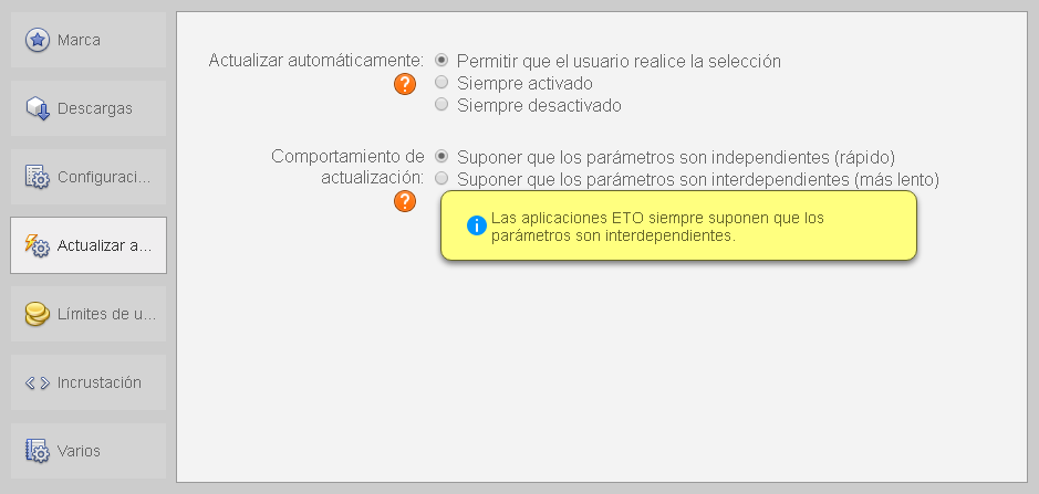 - Suponer que los parámetros son independientes (rápido): el cambio de parámetro no se envía al servidor hasta que se hace clic en el botón Actualizar. Esta opción permite cambiar varios parámetros a la vez.