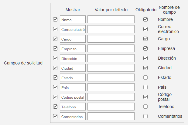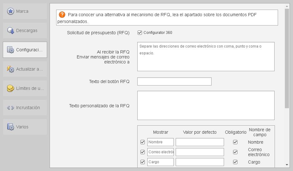 Controla los campos que se muestran al cliente cuando se selecciona el botón RFQ.