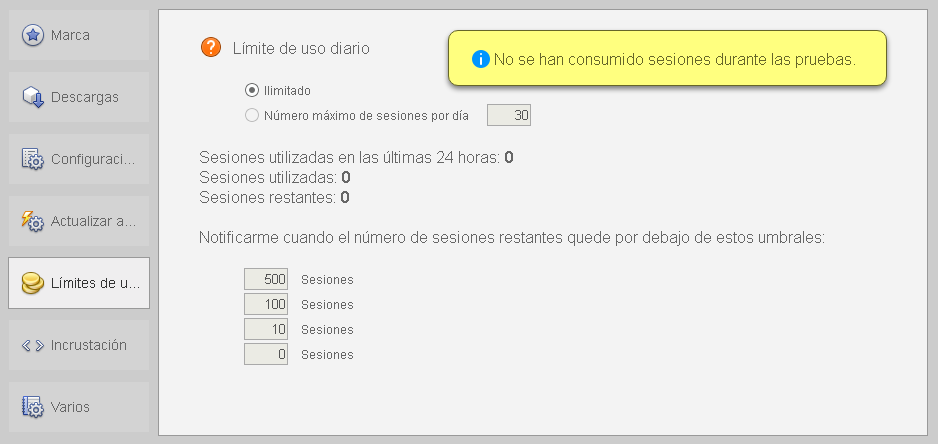 - Para administrar el uso, especifique un número máximo de sesiones que los usuarios finales pueden utilizar por día (un período rotatorio de 24 horas).