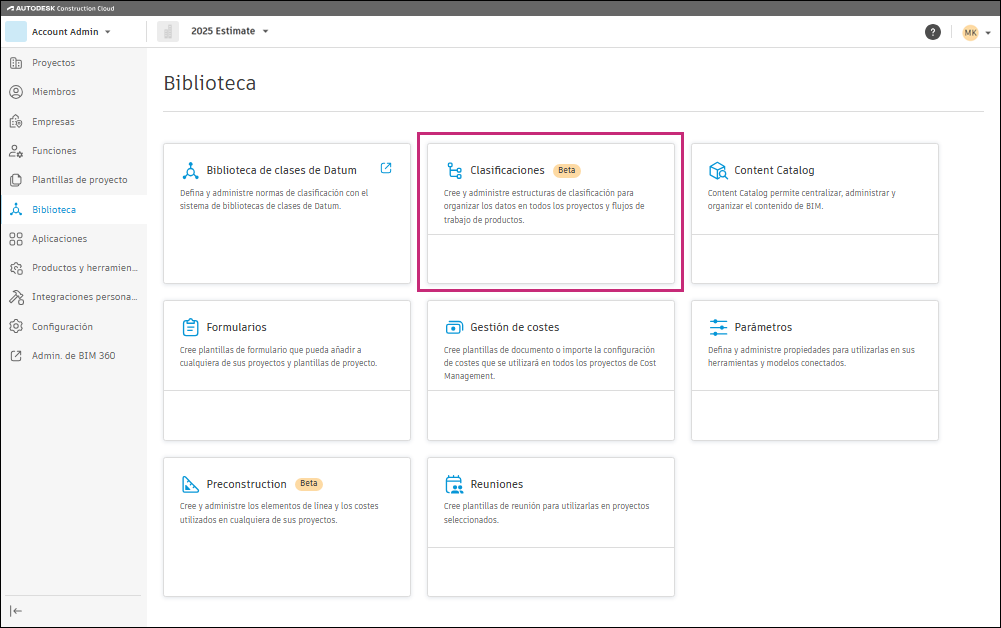La administración de estructuras de clasificación para su cuenta en la Biblioteca permite estandarizar y reutilizar códigos en todos los proyectos y plantillas de proyecto.