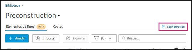 Desde esta página, puede acceder a las fichas Elementos de línea y Costes donde puede configurar estos elementos de biblioteca para su uso en Estimación y Mediciones.