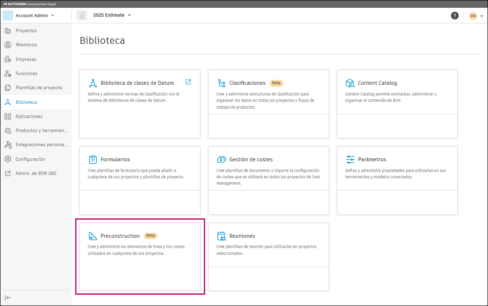 En la herramienta Biblioteca de Administración de cuentas, puede configurar normas predefinidas para costes y elementos de línea que pueden utilizarse como datos predeterminados para los proyectos de fase previa a la construcción en su cuenta.