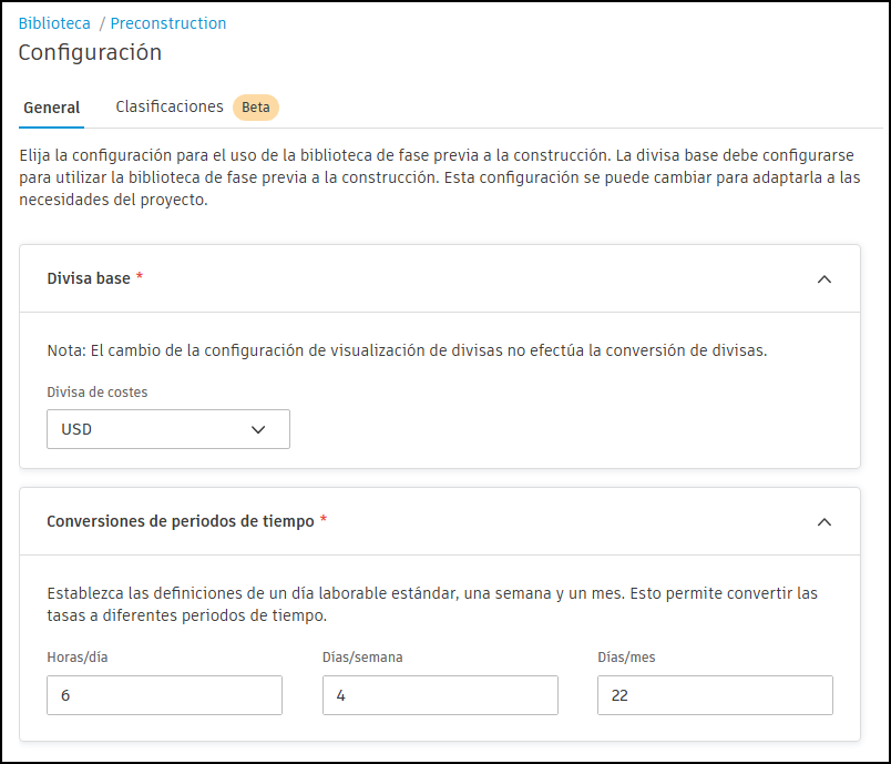 Configure los ajustes generales de la divisa base y la conversión de marco temporal, y asigne clasificaciones a la biblioteca de fase previa a la construcción en la configuración de la biblioteca de fase previa a la construcción Los administradores de cuentas pueden acceder a esta configuración haciendo clic en el vínculo Configuración de la página de la biblioteca de fase previa a la construcción.
