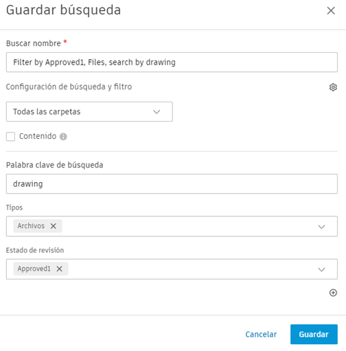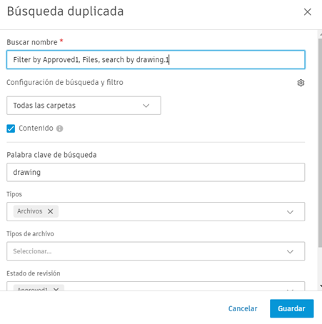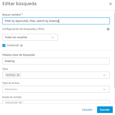 Nombre de búsqueda: edite el nombre de búsqueda con un máximo de 255 caracteres según sea necesario. El nombre predeterminado comprende los filtros de búsqueda seleccionados seguidos de la palabra clave de búsqueda.