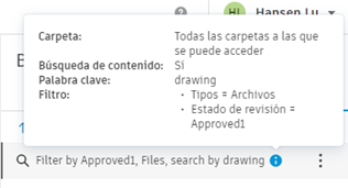 Coloque el cursor sobre el icono de información de una búsqueda guardada para ver los detalles completos de la búsqueda y el filtro.