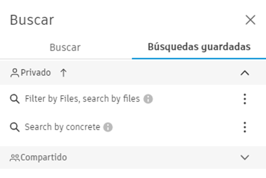 Las búsquedas guardadas se mostrarán por nombre de búsqueda en la sección Privadas de la ficha Búsquedas guardadas. Las búsquedas privadas son personales y no pueden verlas otros miembros del proyecto.