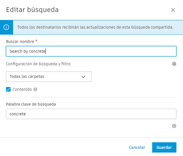 Cuando edite una búsqueda compartida, todos los destinatarios también recibirán automáticamente las actualizaciones.