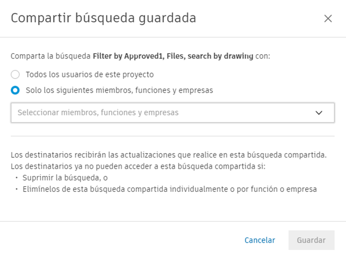 Seleccione esta opción para compartir la búsqueda guardada con todos los miembros del proyecto o con miembros, funciones o empresas seleccionados.