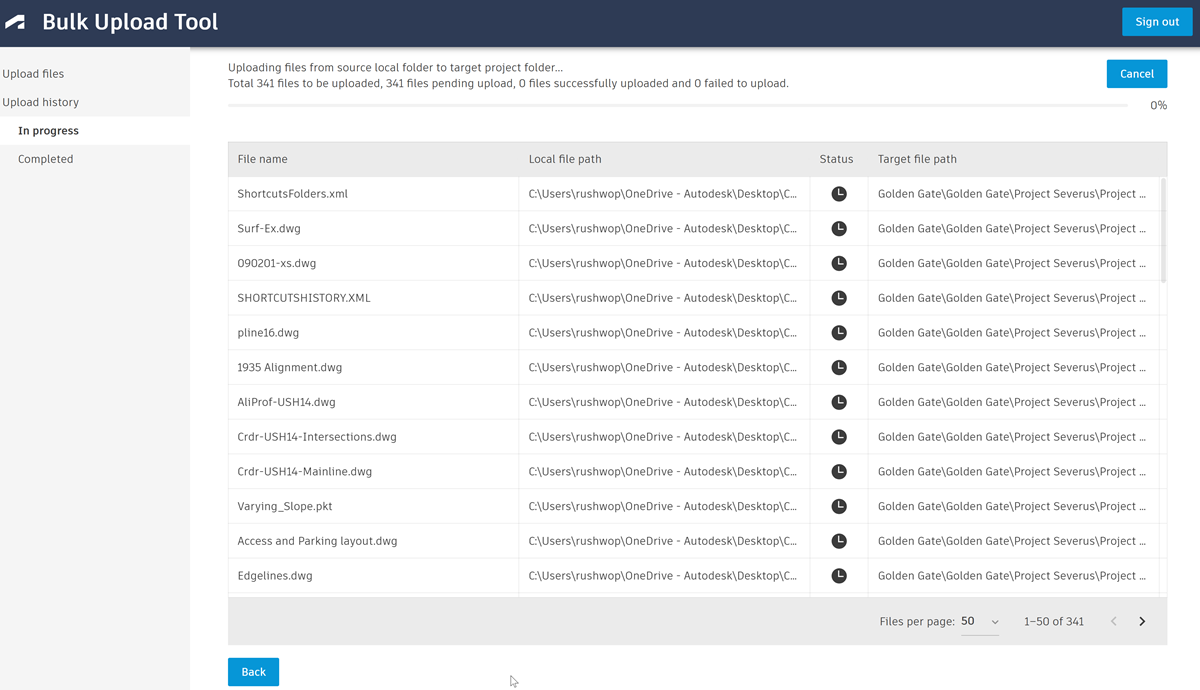 Una vez que haya empezado a cargar archivos con o sin referencias, los detalles de la carga se mostrarán en la ficha En curso. Una vez completada la carga, los detalles se muestran en la ficha Completado.