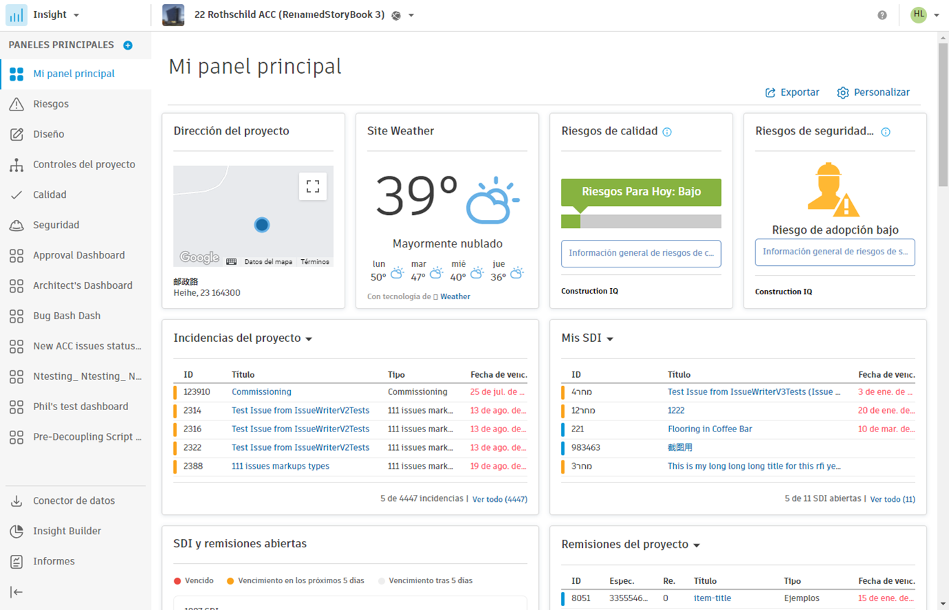 La función Mi panel principal proporciona un espacio fuera de los paneles principales seleccionados, como Riesgos, Diseño, Controles de proyecto, Calidad y Seguridad, lo que permite crear una vista personalizada de los análisis de proyectos.