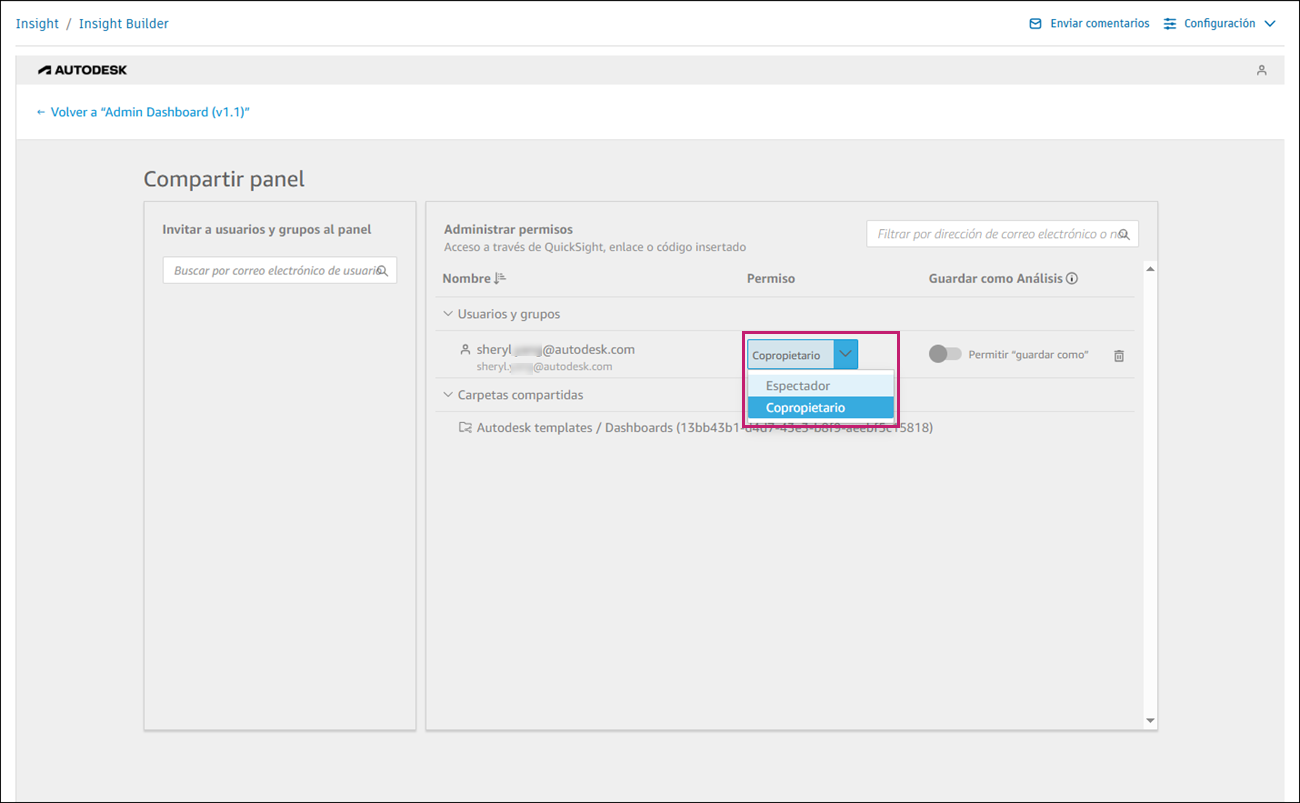 Comparta los paneles principales de Insight Builder con otros usuarios de su organización y controle sus niveles de acceso. Los usuarios pueden ver los paneles principales e interactuar con ellos en función de sus permisos asignados.