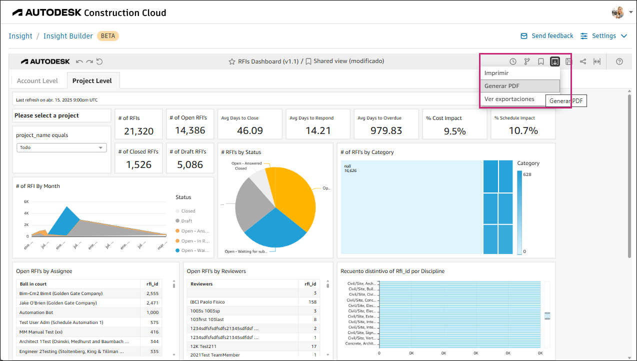 Puede exportar datos de un panel principal a un archivo PDF. Para ello:
