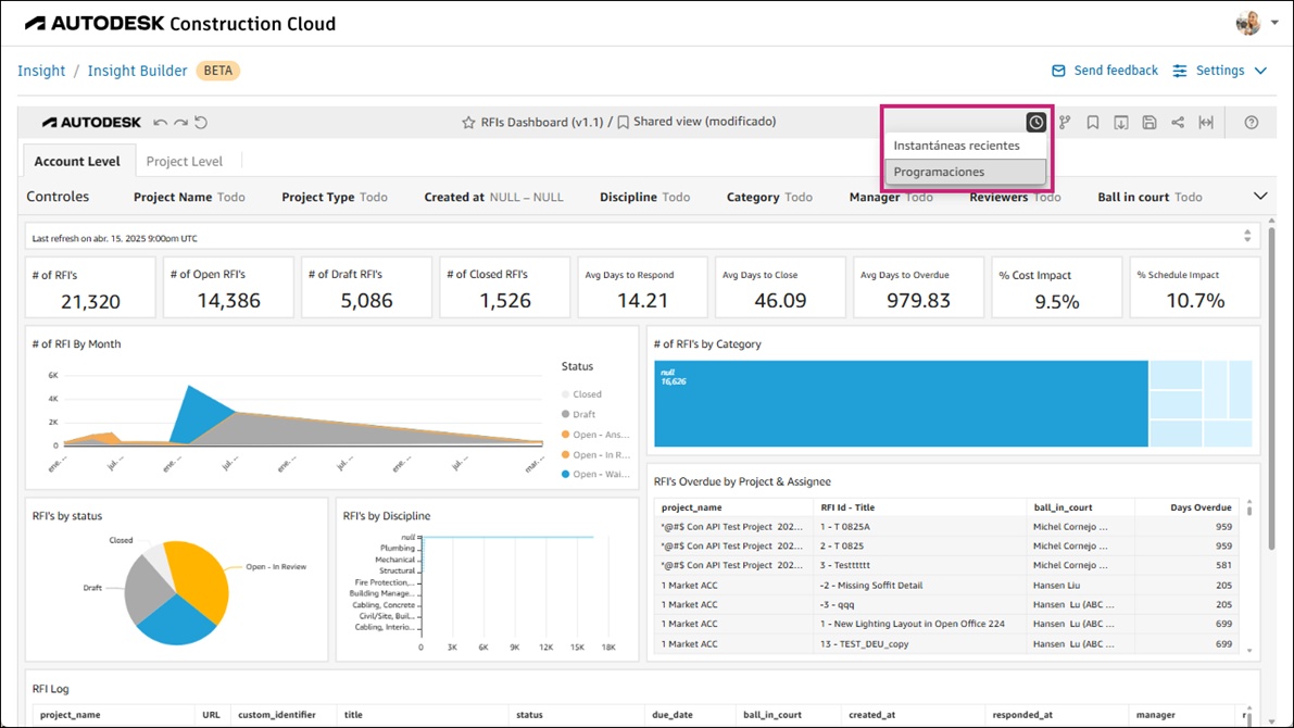 Planifique el envío automático de paneles principales a una cadencia regular. Al programar paneles principales, puede configurar los ajustes específicos del contenido, la fecha y el correo electrónico.