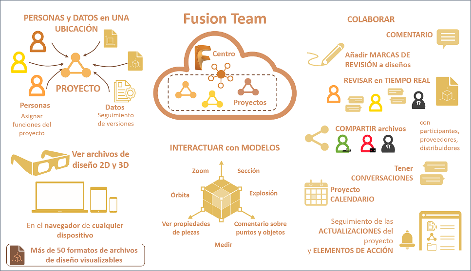 Fusion Team proporciona un espacio de trabajo central en la nube (centro) para sus proyectos.