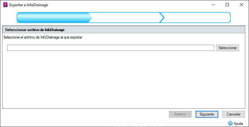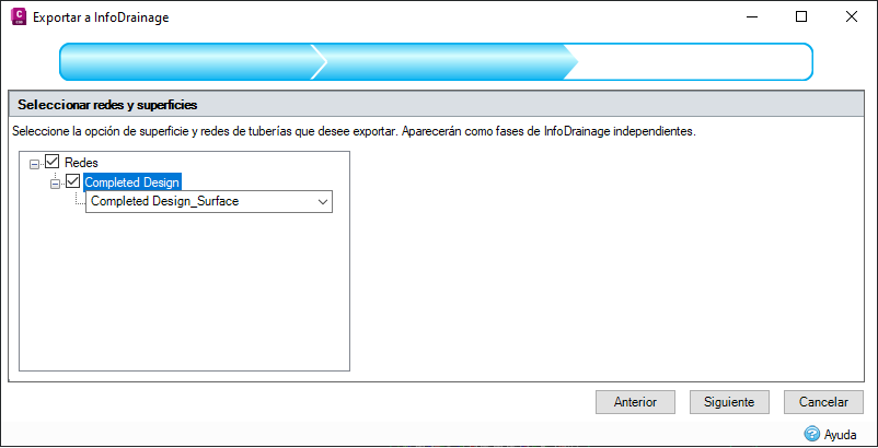 Este paso permite seleccionar redes de tuberías que se exportarán a InfoDrainage. Cada red seleccionada se exportará como una fase.