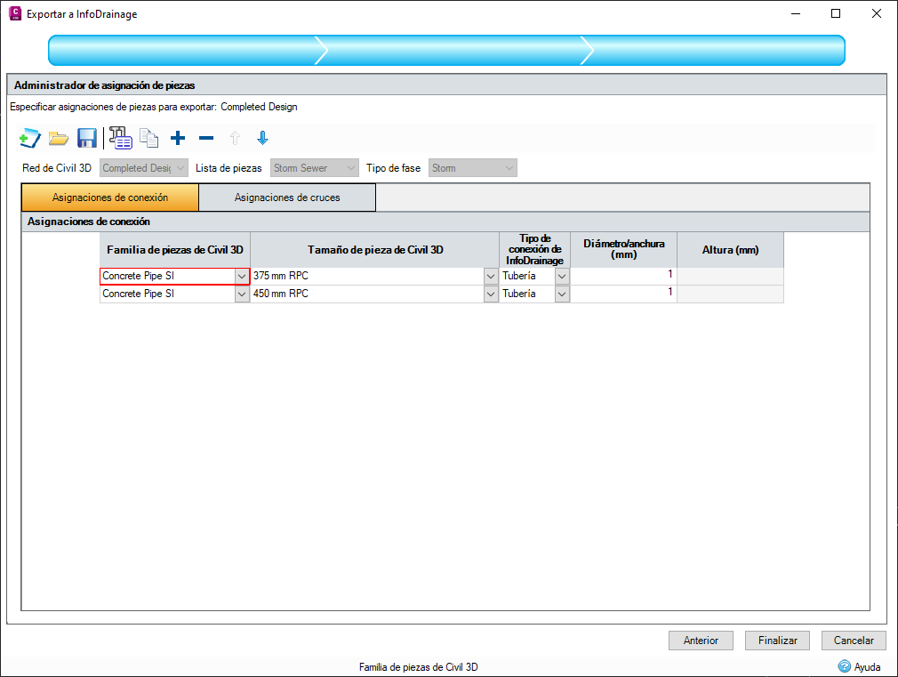 Para cada red seleccionada, habrá un paso de asignación de piezas, que permite asignar tipos de pieza de Civil 3D® a tipos de InfoDrainage. Consulte Asignación de piezas para obtener más información.
