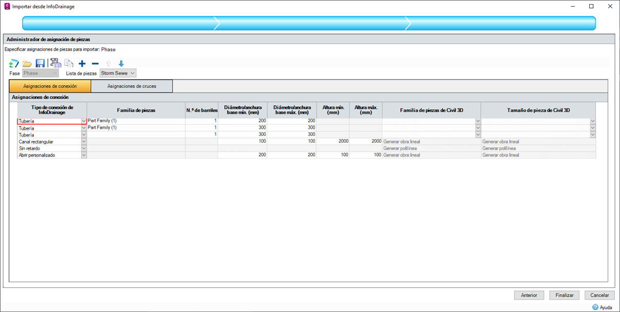 Para cada fase seleccionada, habrá un paso de asignación de piezas, que permite asignar tipos de InfoDrainage a tipos de pieza de Civil 3D. Consulte Asignación de piezas para obtener más información.