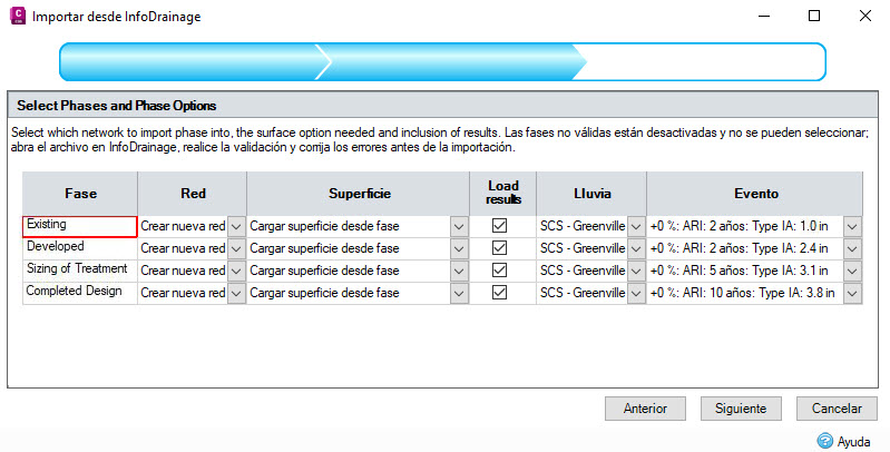 Este paso permite seleccionar las fases y superficies que se importarán desde InfoDrainage. En función de la red seleccionada, se importará cada fase seleccionada como una red de tuberías en el diseño de Civil 3D.