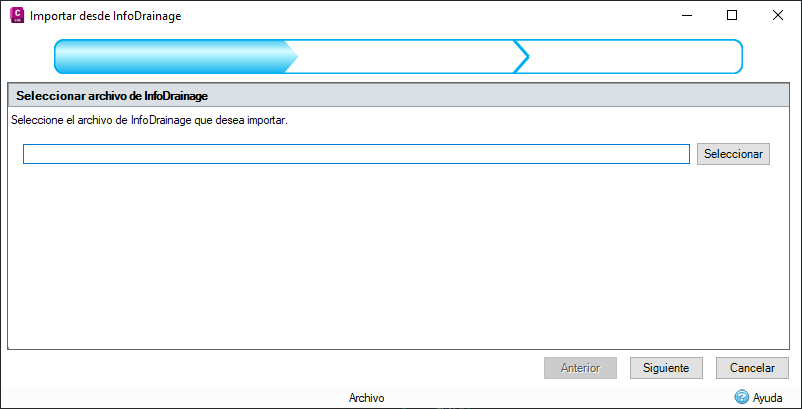 Este paso permite seleccionar el archivo desde el que se va a importar. Al pulsar el botón de selección se abre un cuadro de diálogo de selección de archivos para facilitar la localización del archivo o la carpeta.