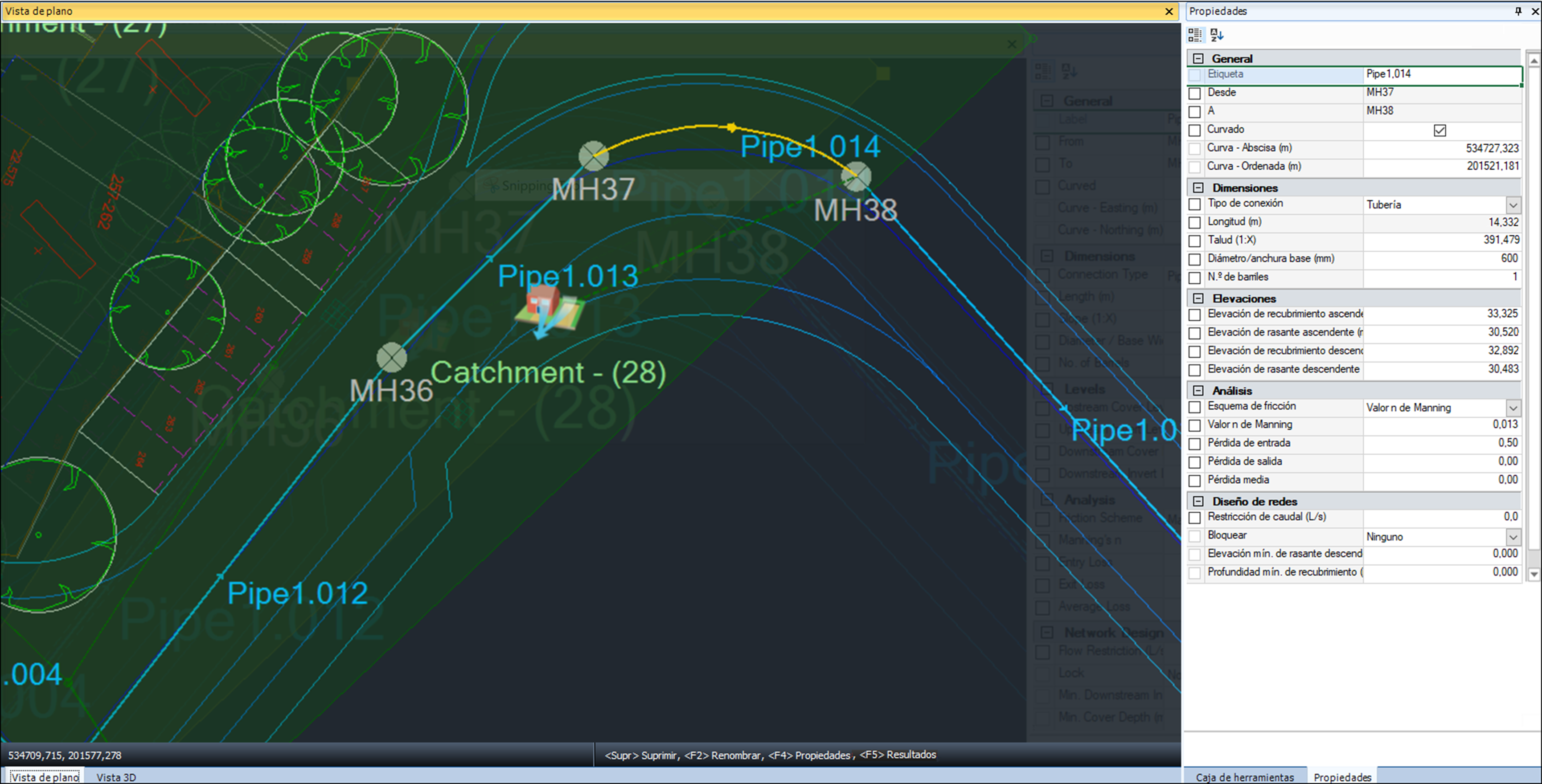 Es importante tener en cuenta que debe ejecutar los cálculos racionales (o el asistente de diseño) y simular la red para mostrar todos los resultados; de lo contrario, no podrá acceder a estos atributos.