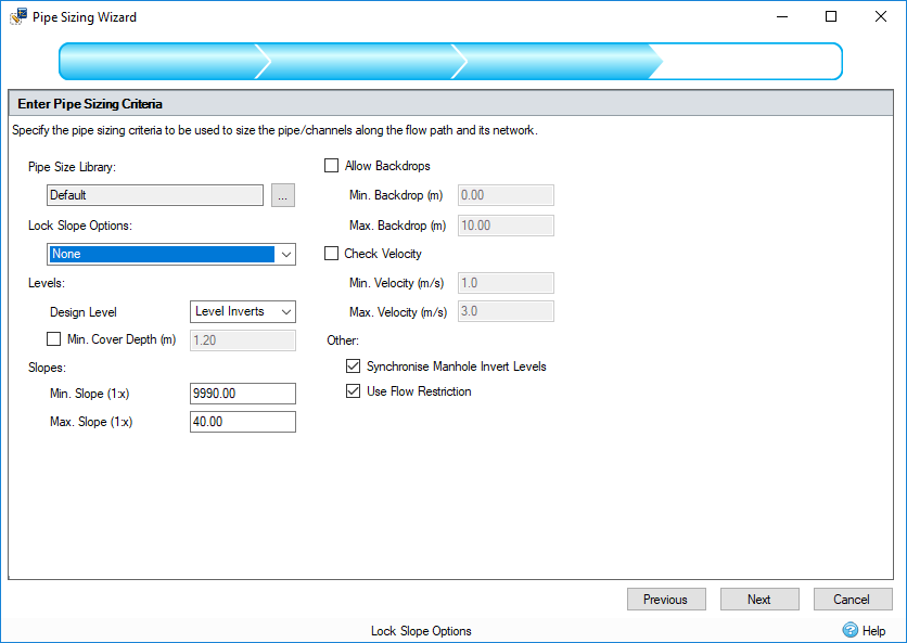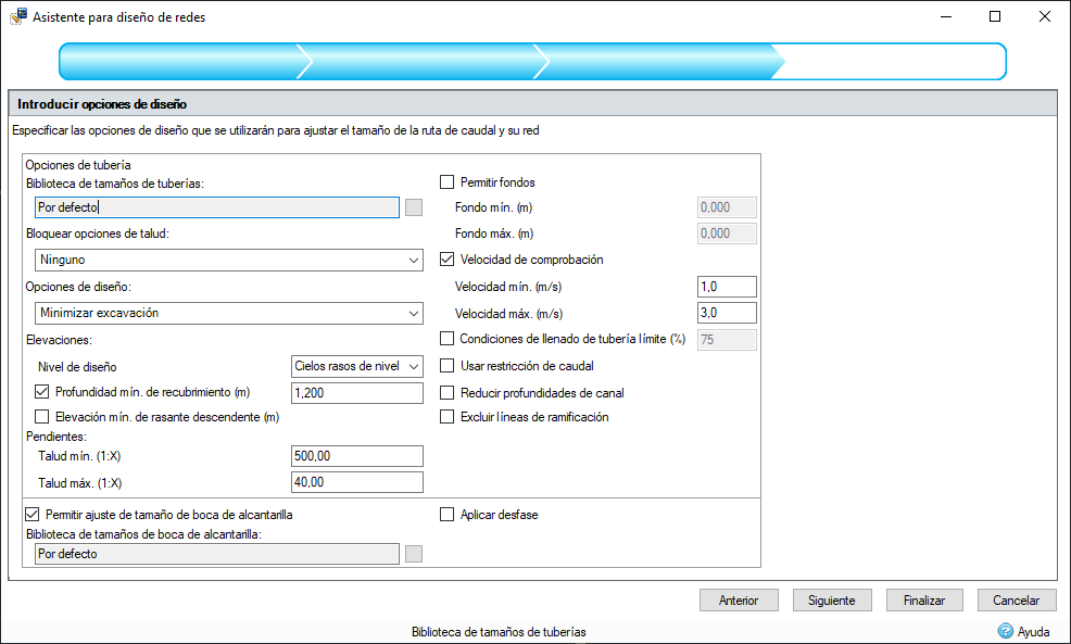 Más opciones de ajuste de tamaño de tuberías. Se han añadido degradados mínimos y máximos para diferentes tamaños de tubería y taludes fijos a las opciones de ajuste de tamaño para reducir el número de cambios manuales necesarios.