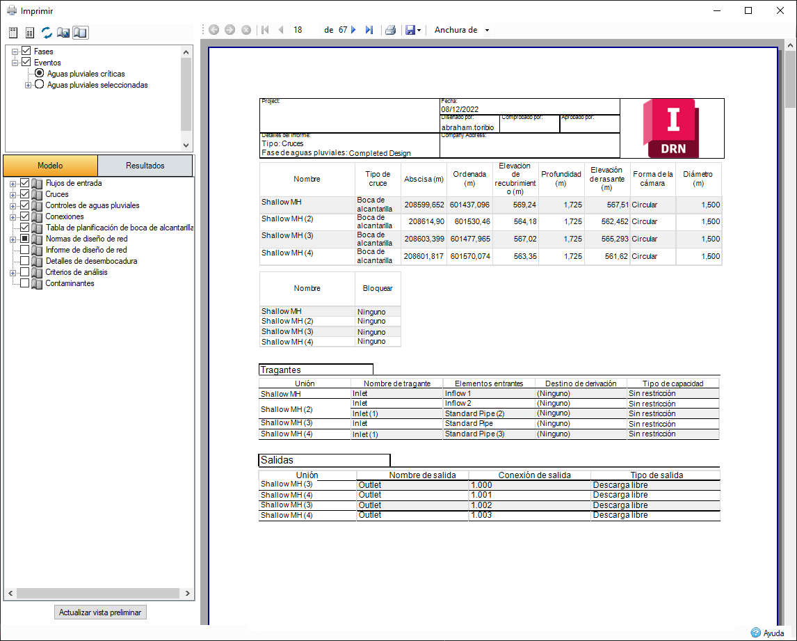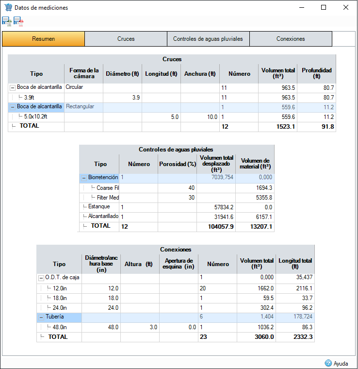 Se puede generar un informe de volumen y cotas en el formato de resumen general del sistema, o bien a nivel detallado para los datos de uniones, conexiones o controles de aguas pluviales, como un paso para determinar los costes del proyecto. Consulte los totales de los tipos de boca de alcantarilla y tubería, o bien realice consultas individuales. Exporte a archivos Excel o PDF para incluirlos en informes o en la información completa de costes.
