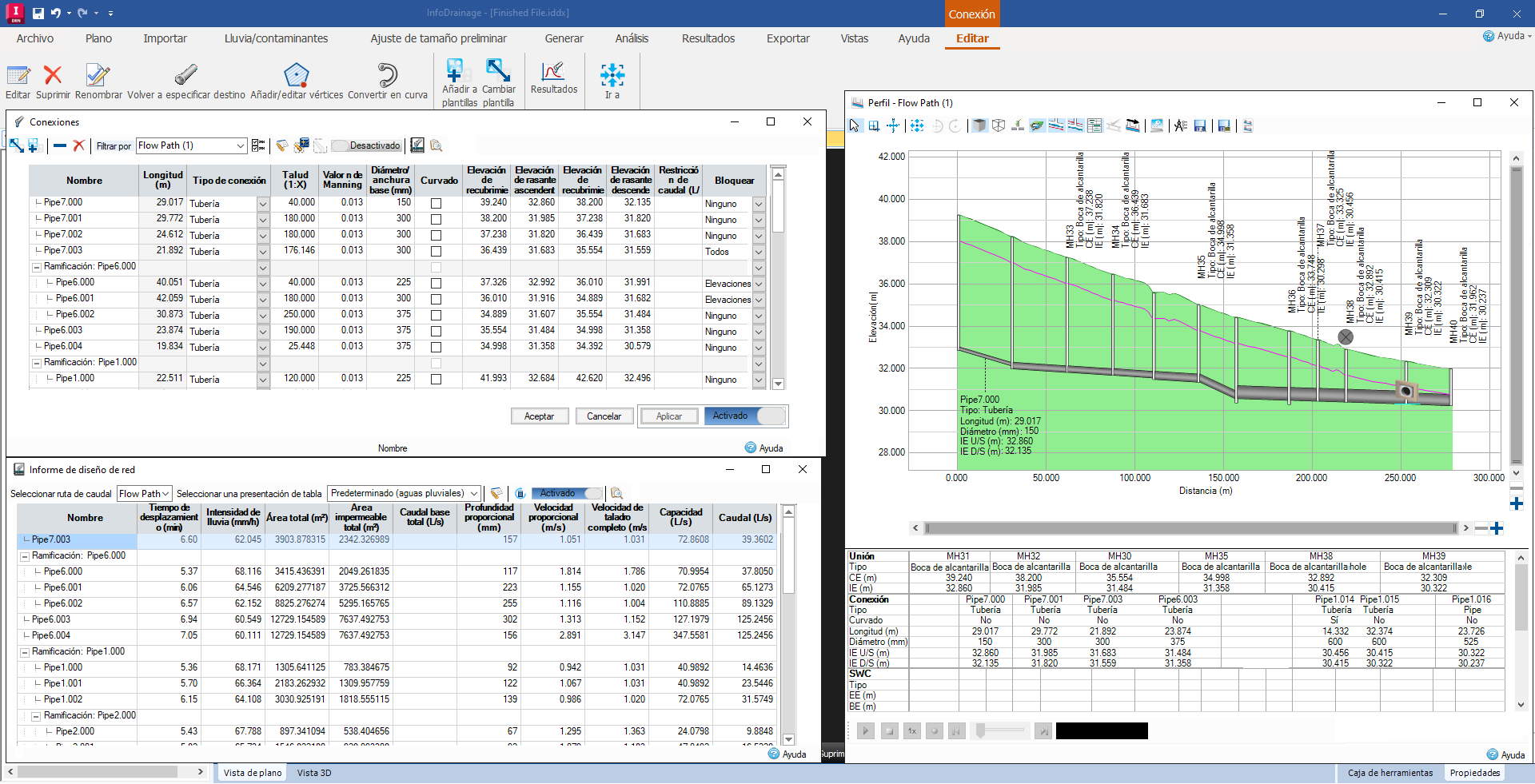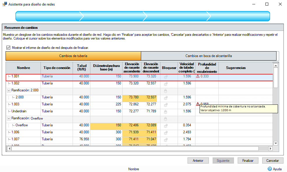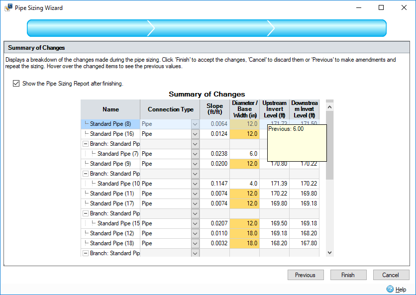 La nueva rutina de ajuste de tamaño de tuberías para la colocación de las tuberías de degradado más planas que cumplan los criterios necesarios minimizará la excavación y reducirá los costes de construcción. Además, puede ajustar el tamaño automáticamente para adaptarse a la velocidad máxima. El tamaño de las tuberías se ajusta a los controles de caudal y se incluyen los fondos, todo ello con advertencias fácilmente visibles y resumidas que facilitan los ajustes del equipo de ingeniería.