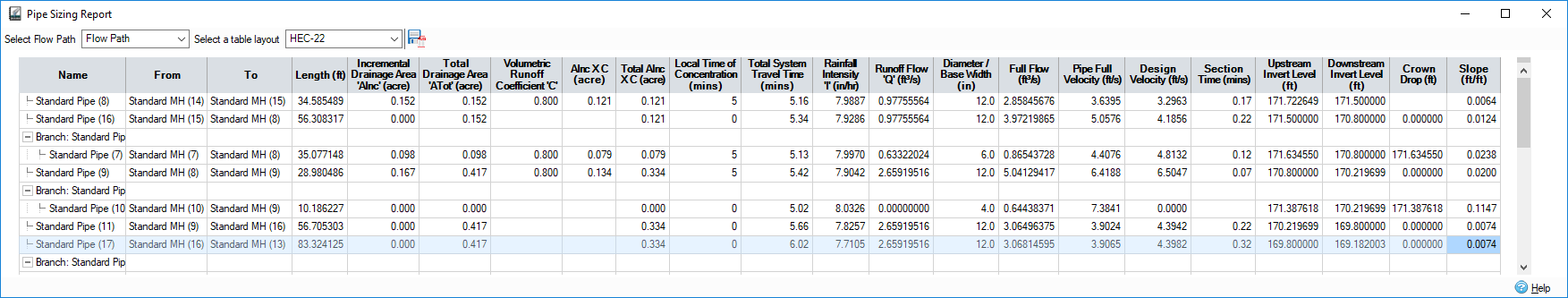 Informe de ajuste de tamaño de tuberías. Visualice y genere rápidamente informes de ajuste de tamaño de tuberías con métodos racionales en formato HEC-22 estándar o presentaciones personalizables y reutilizables para cumplir con los requisitos locales.