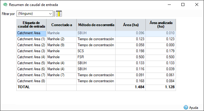 Informe tabular de todas las áreas que contribuyen y que se han analizado para revisar y comunicar fácilmente las áreas totales e impermeables.