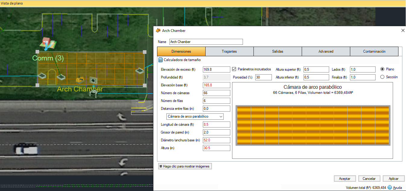 NUEVO control de aguas pluviales de cámara. Diseñe rápidamente cámaras circulares, rectangulares y de arco, o cree y reutilice cámaras personalizadas para almacenar aguas pluviales. Visualice las cámaras en el plano con las opciones de exportación a CAD y SIG disponibles.