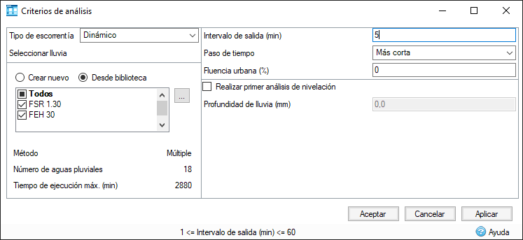 Disponible como opción de análisis estático para cumplir con una variedad de requisitos de escorrentía regionales de EE. UU. a fin de utilizar el enfoque de hidrograma triangular Método racional modificado simplificado.